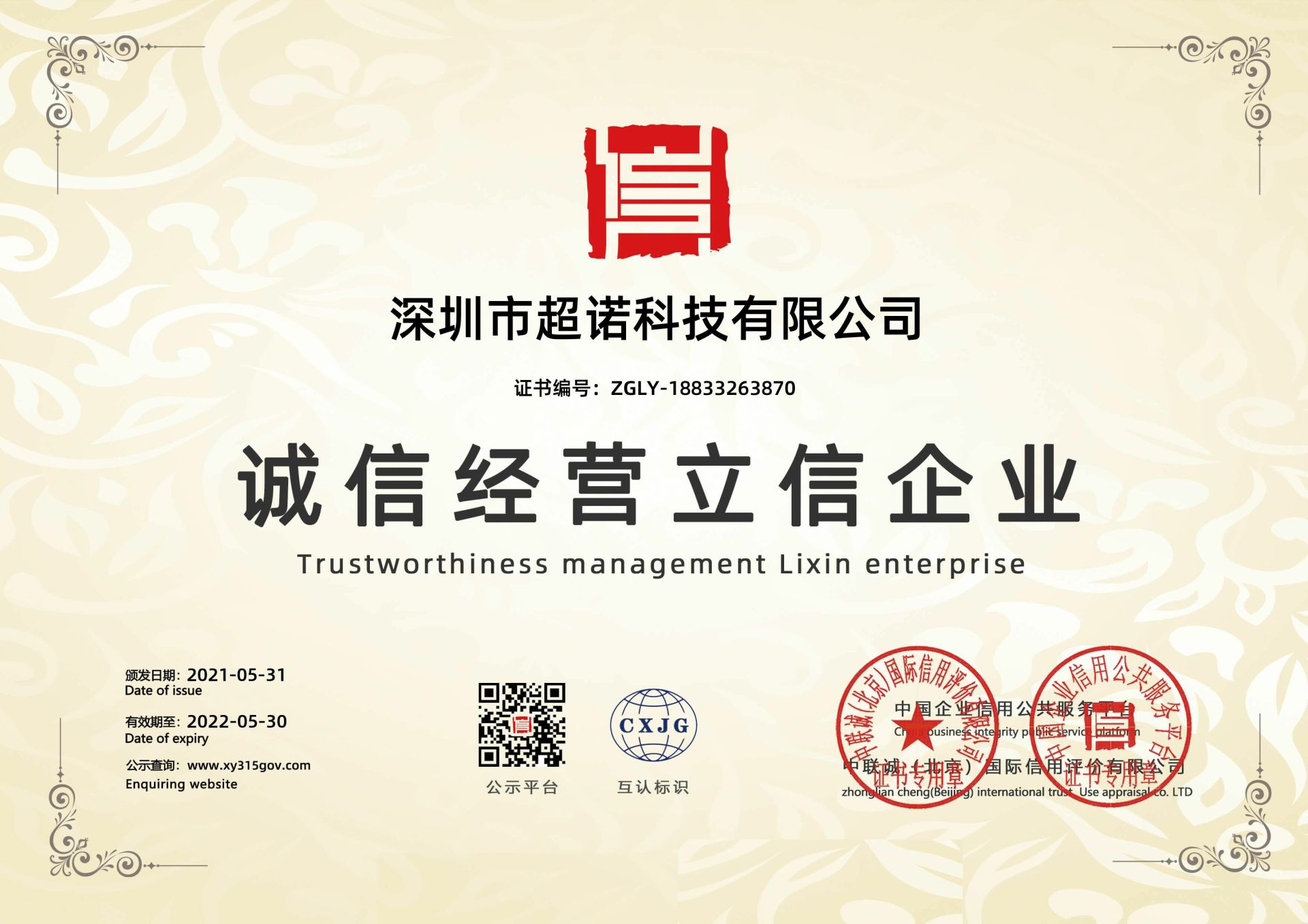 • 公司荣获诚信经营立信企业资质